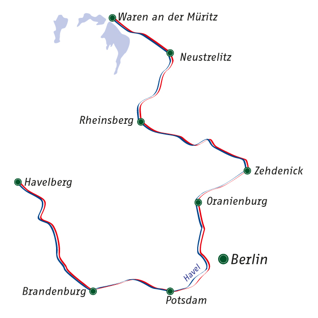 Der Havelradweg führt durch die Bundesländer Mecklenburg-Vorpommern, Berlin, Brandenburg und Sachsen-Anhalt. Auf der 10 Tage-Radtour von Waren an der der Müritz über Rheinsberg, Oranienburg und Potsdam nach Havelberg, begleiten Sie die Havel von der Quelle auf ihrem herrlichen und abwechslungsreichen Weg in Richtung Elbe. Auf sehr gut ausgebauten Radwegen fahren Sie durch unberührte Naturparadiese, vorbei an preußischer Kultur, mit zahlreichen Schlössern, Lustgärten, Parkanlagen und bedeutenden Klöstern.