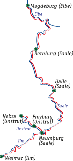 Die Radwanderung beginnt in der Kulturstadt "Weimar". Auf dem Ilmtal-Radweg fahren Sie zunächst nach Bad Kösen, wo die Ilm in die Saale mündet und weiter entlang der Saale bis nach Naumburg. Von dort aus bietet sich die Möglichkeit für einen Abstecher ins Unstrut-Tal. Denn auch kulinarisch gibt es viel zu entdecken. Neben der guten thüringischen Küche werden Sie ganz sicher auch von den Weinen des Weinanbaugebietes Saale-Unstrut begeistert sein. Nördlich entlang der Saale folgen Bad Dürrenberg, Merseburg und Halle, die größte Stadt am Saale-Radwanderweg mit vielen Sehenswürdigkeiten. Gemütlich fließt die Saale nun durch grüne Wiesen und Auenwälder. Am Saaleufer entlang geht es vorbei an trutzigen Burgen und imposanten Schlössern. Am Ende Ihrer Radtour laden sehenswerte Städtchen und Städte wie Barby, Schönebeck und Magdeburg entlang der Elbe zum Verweilen ein.