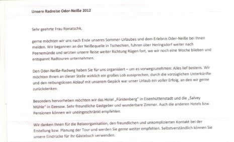 "Liebes Corso-Team, erstmal herzlichen Dank für die sehr gute Organisation unserer Reise auf dem "Oder-Neiße-Radweg". Hat alles gepaßt. Natur und Landschaften pur aber auch schöne Dörfchen und Städte. Wir hatten natürlich viele Abstecher gemacht wie zum Kloster Chorin, dem Schiffshebewerk Niederfinow, oder am Dreiländereck kurz ein Stück Tschechien und Polen. So kamen bis Ueckermünde 640 Radkilometer zusammen. Wir waren dann so fit, daß es schade war die Tour nicht bis zur Insel Usedom geplant zu haben. Auch der Rücktransport hat perfekt funktioniert. Diese Tour hat uns letztes Jahr Onkel Corso empfohlen, Danke dafür! Daß bei der Reisebestätigung auch Prospekte der angesteuerten Hotels beilagen, war hilfreich. Noch ein Tipp für Nachahmer, entlang der Oder kann es schon mal 30 bis 50 km dauern bis ein Penny oder ALDI zum Wasserfassen auftaucht!"(Rose u Günther B. unterwegs auf dem Oder-Neiße-Radweg im Juli 2012)